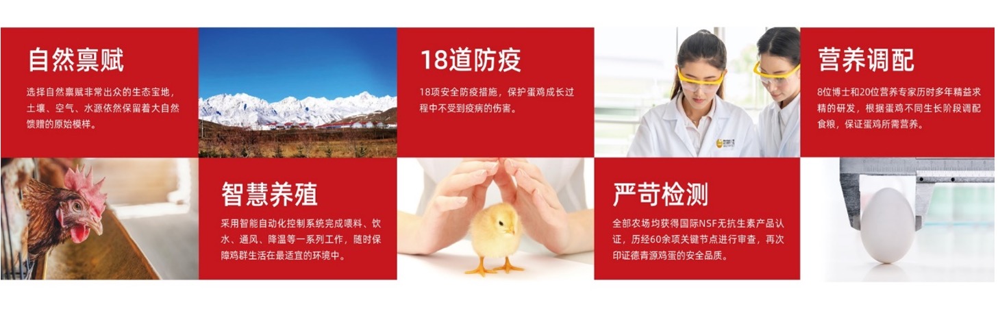 德青源始終把雞蛋產(chǎn)品安全放在首位,曾首創(chuàng)“雞蛋身份證制度”,結(jié)束了我國(guó)雞蛋“無(wú)標(biāo)準(zhǔn)、無(wú)生產(chǎn)日期、無(wú)品牌”的三無(wú)歷史,并推動(dòng)制定了中國(guó)第一部雞蛋標(biāo)準(zhǔn),開(kāi)創(chuàng)了我國(guó)雞蛋品牌的先河。德青源擁有國(guó)家蛋品工程技術(shù)研究中心的資源平臺(tái),建立了一套完善的蛋雞標(biāo)準(zhǔn)化運(yùn)營(yíng)管理體系,確保每個(gè)農(nóng)場(chǎng)生產(chǎn)的雞蛋都可全程追溯。